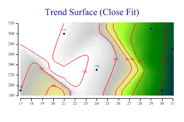 This example shows a fitted surface which is typical of height-map data. Temperature or pressure data would also be a good candidate for this style, using one of the accepted styles of false-color banding. See also ...SharpPlot Members | CloudChartStyle Property | ContourPlotStyle Property | ResponsePlotStyle Property |
