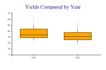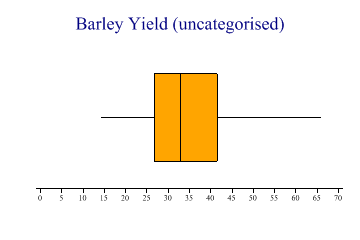 Tutorials > Chart Tutorials > Using the Box-and-Whisker Plot Using the Box-and-Whisker PlotA selection of simple Box-and-Whisker charts are developed here, all using a ‘classic’ dataset from the 1930s showing barley yields at various farms in Canada. The trials were made at 6 farms over 2 years, with 10 varieties of barley, giving 120 data-points in total. The entire dataset is shown for reference in the glossary. The object of the trial was to see what the significant effects were, and the boxplot is an ideal way to explore relationships between variables. You might also check on the histograms of various subsets of the data, maybe using a Multiple chart to split the data by various criteria. Spread of a single seriesThis chart simple takes the entire yield vector, and determines the ‘shape’ of the distribution.