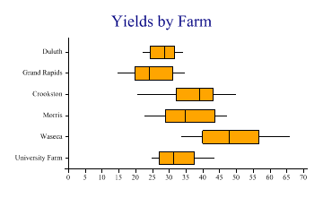 sp.Heading = "Yields Compared by Year"; sp.SetColors(Color.Orange); sp.YAxisStyle = YAxisStyles.ForceZero; sp.BoxPlotStyle = BoxPlotStyles.DecileWhiskers; sp.DrawBoxPlot(yield,years); Note that the BoxPlot call now has 2 arguments, the first is the data, and the second the categorisation. This example is drawn with ‘Deciles’ shown in the whiskers, which indicate that the lower end of the range has a few outlying values. However it is fairly clear that there was not a big difference between the years. Several categories, drawn horizontallySo maybe the farm was an important factor? Let’s try passing the farm name as the category, using a horizontal plot to leave plenty of room for the long names.