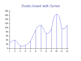 sp.LineGraphStyle = LineGraphStyles.Curves; Points are joined with computed (cubic) Bezier curves, where the smoothness is determined by the ‘flexibility’ parameter which may vary between zero (which joins the points with straight lines) to approx 12. The default value of 3 will normally give reasonable results. High values may start to draw loops and other artifacts on very noisy data series. See also ...SharpPlot | CloudChartStyle | LineGraphStyle | PolarChartStyle | ScatterPlotStyle |