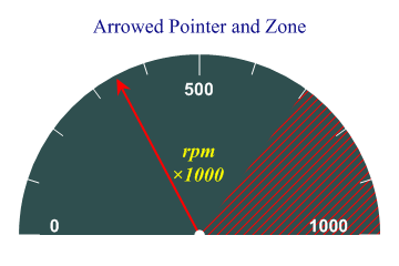 sp.SetMargins(24,24,12,12); sp.Heading = "Arrowed Pointer and Zone"; sp.SetAxisStyle(Color.White,LineStyle.Solid,2); sp.SetXLabelFont("Arial",16,FontStyle.Bold,Color.White); sp.SetChartBackground(Color.DarkSlateGray,FillStyle.Solid); sp.SetPenWidths(2); sp.SetColors(Color.Red); sp.DialChartStyle = DialChartStyles.ArrowLines|DialChartStyles.WedgeZones; sp.SetXRange(1000); sp.SetXTickMarks(500,4); xzone = new Zone(700,1000,Color.Red,FillStyle.ForwardDiagonal); sp.SetXZones(xzone); sp.XCaption = "rpm\n×1000"; sp.SetXCaptionFont("Times",18,FontStyle.Italic|FontStyle.Bold,Color.Yellow); sp.CaptionLineSpacing = 120; sp.DrawDialChart(345); This chart is designed to look as if it came from an instrument panel. The ‘red zone’ is very prominently marked with a wedge of color and the x-caption is used to label the value. A typical application might use several of these dials to make a ‘cockpit’ view of selected key parameters for a company healthcheck. Two Warning Zones