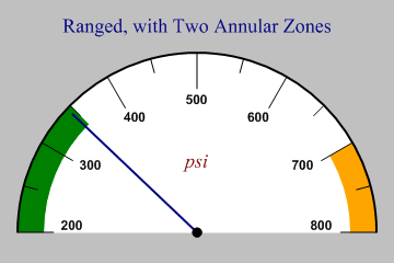 sp.SetMargins(24,24,12,12); sp.Heading = "Ranged, with Two Annular Zones"; sp.SetAxisStyle(Color.Black,LineStyle.Solid,2); sp.SetXLabelFont("Arial",12,FontStyle.Bold); sp.SetPenWidths(2); sp.SetBackground(Color.Silver,FillStyle.Solid); sp.SetChartBackground(Color.White,FillStyle.Solid); sp.SetXRange(200,800); sp.SetXTickMarks(100,1); xzones = new Zone[]{new Zone(200,350,Color.Green),new Zone(700,800,Color.Orange)}; sp.SetXZones(xzones); sp.XCaption = "psi"; sp.SetXCaptionFont("times",18,FontStyle.Italic,Color.Maroon); sp.DrawDialChart(345); This chart uses ‘annular’ zones (the default) to show two significant ranges in different colors. This gives a very clear indication of the health (or otherwise) of some key indicator of company performance. Multiple Pointers and Zones