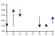 Reference > Methods > DrawMinMaxChart Method SharpPlot.DrawMinMaxChart MethodConstruct hi-lo plot, joining maximum with minimum data values for each axis value. Examplesp.SetMargins(12,12,18,4); open = new int[] {190,150,310,240,140,170}; close = new int[] {150,310,240,140,170,240}; xdata = new int[] {17,18,19,22,23,24}; sp.SetMarkers(Marker.Bullet); sp.MinMaxChartStyle = MinMaxChartStyles.ArrowLines|MinMaxChartStyles.DriftMarkers; sp.DrawMinMaxChart(open,close,xdata); The short tutorial shows a few of the possibilities and some sample code. Overloads