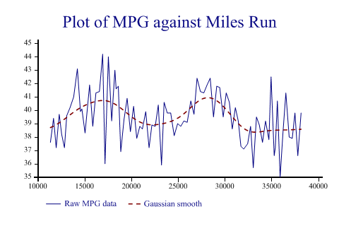 Tutorials > Chart Tutorials > Working with Linegraphs and Timeseries Working with Linegraphs and TimeseriesAlthough it is called ‘Linegraph’ this SharpPlot method can do markers, risers from the X-axis, filled surfaces and so on, in any combination. Typically it is used for timeseries data, but of course it can also draw any continuous curve when given x as well as y co-ordinates. A Typical Timeseries with AveragingSharpPlot offers several ways to smooth a typically noisy timeseries. You can use the ‘Trend’ style to add a gaussian-weighted moving average or you can use any combination of traditional smoothing methods. This example has the results of monitoring the fuel consumption of a typical family car (measured in miles per gallon of fuel) which has plenty of random variation and some clear cycles (probably winter and summer).