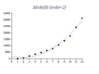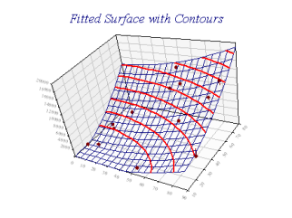 Here, the model is quadratic in both X and Y. Contour lines are shown, and risers have been used to show the residual values in the Z-direction. See also ...SharpPlot | CloudChartStyle | LineGraphStyle | ScatterPlotStyle | SetModelSpan |