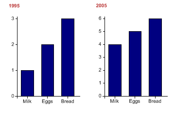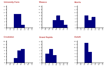 sp.SetPageLabels(new string[]{"1995","2005"}); sp.SetXLabels(new string[]{"Milk","Eggs","Bread"}); sp.YAxisStyle = YAxisStyles.ForceZero; sp.SetLabelFont("Arial",13); sp.SetCaptionFont("Arial",15,FontStyle.Bold,Color.Firebrick); sp.DrawMultiple(ChartType.BarChart,data); PageLabels are a useful way of labelling the cells in the trellis. A Collection of HistogramsThe barley-yield data could be shown on a single histogram, but often this conceals some systematic variation in the data. In this example, the farm is used to create a trellis of charts, each showing the spread of the data at the individual farms. Although the experiment was designed to investigate various barley varieties, this plot makes it very clear that the farm is going to be a big factor in the outcome. A quick glance shows that yields at Wasaca may be quite variable, but that it easily beats both Grand Rapids and Duluth (which is consistently very poor).