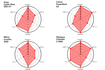 sp.SetMargins(36,12,20,0); cameradata = new double[] {4.5,3.1,2,4.5,5,2.5,5,5,3,5,3.5,2.5,4.5,3,3,4.5,2,4,4.5, 4.5,2.5,4.5,4.5,4.5}; cameratype = AE.Compress(6,new string[]{"Sony\nCyber-Shot\nDSC-V1", "Canon\nPowerShot\nG5","Nikon\nCoolPix\n5400","Olympus\nCamedia\nC-5060"}); cameracap = new string[]{"Résolution","Rendu","Couleur","Sensibilité","Flash", "Autofocus","Rapidité"}; sp.SplitBy(cameratype); // Sets trellis sp.SetFillStyles(FillStyle.Opacity42); sp.SetColors(Color.Red); sp.SetMarkers(Marker.SmallBullet); sp.SetLineStyles(LineStyle.Solid); sp.SetPenWidths(1); sp.PolarChartStyle = PolarChartStyles.SurfaceShading|PolarChartStyles.GridLines| PolarChartStyles.Markers; sp.YAxisStyle = YAxisStyles.ForceZero; sp.SetXLabels(cameracap); sp.XLabelFormat = "XXXXXXXX;"; sp.SetLabelFont("Arial",6,Color.Black); sp.SetCaptionFont("Arial",14,FontStyle.Bold,Color.Black); sp.DrawMultiple(ChartType.PolarChart,cameradata); This is likely to make visual comparison much easier than attempting to overlay the radar plots from several cameras on the same chart. |