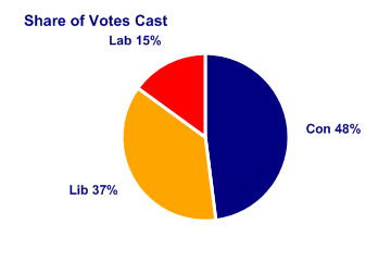 sp.SetMargins(18,24,18,0); Party = new string[]{"Con","Lib","Lab"}; Votepc = new int[] {48,37,15}; sp.Heading = "Share of\nVotes Cast"; sp.HeadingStyle = HeadingStyles.Left; sp.SetHeadingFont("ARB",14); sp.PieChartStyle = PieChartStyles.ValueTags; sp.PieStartAngle = 90; sp.SetEdgeStyle(Color.White,LineStyle.Solid,3); // SharpPlot.SetEdgeStyle sp.ValueTagStyle = ValueTagStyles.Inside; sp.SetValueFont("ARB",18,Color.White); sp.ValueTagFormat = "#0%"; sp.SetColors(new Color[]{Color.Navy,Color.Orange,Color.Red}); // Party colors sp.DrawPieChart(Votepc); sp.SetKeyText(Party); sp.KeyStyle = KeyStyles.Vertical|KeyStyles.Boxed|KeyStyles.Rounded| KeyStyles.Shadowed|KeyStyles.LeftAlign|KeyStyles.BottomAlign; sp.SetKeyFont("ARB",11,Color.Navy); The numbers are written inside each sector here. Obviously, this approach only works if most of the sectors are reasonably large as SharpPlot will simply omit any labels which don’t fit. This pie starts drawing from the 3:00 line (rather than midnight) and uses a thick white edge to give a ‘dissected’ appearance. Note that SharpPlot does not multiply the values by 100 here – the ‘%’ symbol is treated like any other insertion character and has no special meaning. Merging values and labelsThis is a very similar example, but instead of drawing a separate legend, it uses a special format string to merge the X-label text into the spider tags. The string ‘XL’ is treated as an insertion point for the corresponding value from the array of labels.