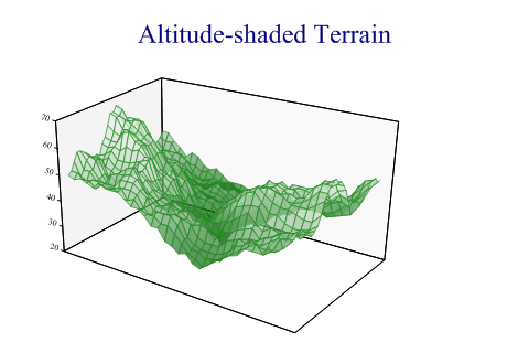 sp.SetMargins(48,12,24,0); sp.Heading = "Altitude-shaded Terrain"; sp.ResponsePlotStyle = ResponsePlotStyles.WallShading| ResponsePlotStyles.TiledSurface|ResponsePlotStyles.AltitudeShading; sp.XAxisStyle = XAxisStyles.PlainAxis; sp.YAxisStyle = YAxisStyles.PlainAxis; sp.SetFillStyles(FillStyle.Opacity66); sp.SetColors(Color.ForestGreen); sp.DrawResponsePlot(terrainData); This works very well with this style of generated fractal landscape. SummaryThe response plot can be a very good way to visualise a computed surface in 3 dimensions. |