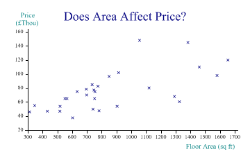 Tutorials > Chart Tutorials > Using Scatter Plots with XY Data Using Scatter Plots with XY DataThe scatterplot (or scatter diagram) is almost always the first step in analysing any collection of data. Typically you are trying ti isolate one or more causes, in the attempt to predict some effect. These examples all use some data on house-prices, with the idea of being able to predict the price of any house given its type and floor area. A Simple Scatter of 2 VariablesThe first step is simply to plot the price against most likely cause (floor area) as a simple xy plot: