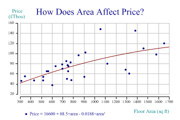So there is a relationship here, but there is also a lot of apparently random noise. Using a Quadratic ModelThe second example shows a ‘best fit’ model, assuming that there may be a quadratic relationship between floor area and price: