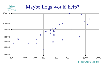sp.Heading = "Maybe Logs would help?"; sp.YCaption = "Price\n(£Thou)"; sp.XCaption = "Floor Area (sq ft)"; sp.YAxisStyle = YAxisStyles.LogScale|YAxisStyles.AtEndCaption; sp.XAxisStyle = XAxisStyles.LogScale; sp.ScatterPlotStyle = ScatterPlotStyles.GridLines; sp.DrawScatterPlot(price,area); Transforming, scaling or shifting the data is often an essential part of helping to see patterns. However it made very little difference in this particular example! Adding Another DimensionMaybe the type of house is an important factor here?