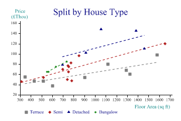 Suddenly, this makes the prediction a lot more reliable. We can see that for terrace houses (the grey squares) the relationship between area and price is quite linear and has very little scatter. Semi-detached houses all cluster at the left-hand end, apart from one huge one which we may want to disregard, as being very atypical. Detached houses follow a different model entirely, and bungalows are apparently more sensitive to area, but we have very little data for them. sp.Heading = "Split by House Type"; sp.YAxisStyle = YAxisStyles.AtEndCaption; sp.YCaption = "Price\n(£Thou)"; sp.YFactor = 1000; sp.XCaption = "Floor Area (sq ft)"; housetype = new int[] {1,2,2,3,3,2,1,1,2,4,4,1,2,2,3,2,1,1,2,3,1,1,4,3,1,2,2,2,4}; sp.SplitBy(housetype); sp.ScatterPlotStyle = ScatterPlotStyles.ModelFit; sp.EquationStyle = EquationStyles.SpanData; sp.SetMarkers(new Marker[]{Marker.Block,Marker.Lozenge,Marker.Triangle,Marker.Bullet}); sp.SetColors(new Color[]{Color.Gray,Color.Gray,Color.Firebrick,Color.Firebrick, Color.Navy,Color.Navy,Color.ForestGreen,Color.ForestGreen}); sp.SetLineStyles(LineStyle.Dash); sp.SetPenWidths(1.2); sp.DrawScatterPlot(price,area); sp.SetKeyText(new string[]{"Terrace","","Semi","","Detached","","Bungalow"}); Note the ‘placeholder’ entries in the key text here. SharpPlot adds a key placeholder for each series and for each modelfit (or trendline) added to it. This allows you to add specific legends to describe the model as well as to annotate each marker. However in this case the model is ‘obvious’ and we just have empty strings for the alternate entries in the legend. This is also the reason why the color cycle is preset with pair of matching colors – the marker takes the first of the pair and the line takes the second. SummaryBy plotting the raw data, and trying a few splits on different dimensions, you can usually begin to understand the relationships involved. SharpPlot provides some simple tools for adding fitted models and showing the user the resulting equation. See also ...More about Bubble Charts | Understanding Contour Plots |
