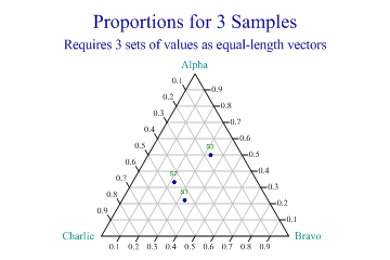 Tutorials > Chart Tutorials > Triangle Plots for Proportions Triangle Plots for ProportionsThe Triangle chart is used to analyse data where there are three important constituents, summing to unity. It is common in Geology and Chemical Engineering where a set of 3 key ingredients determines the outcome from some process. Plotting the Proportions of 3 values
