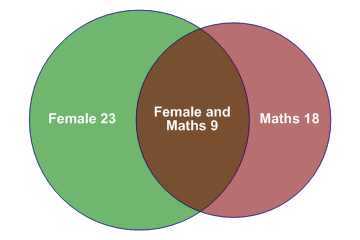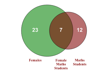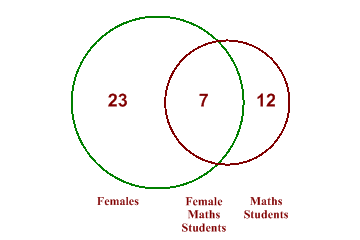 Tutorials > Chart Tutorials > Using Venn diagrams Using Venn diagramsVenn diagrams are used to summarise set membership information. SharpPlot will draw a proportional diagram for two sets (and one intersection) but for the three set case the chart is purely diagrammatic, as it is impossible to scale all the regions in the correct proportion. Diagrams for higher numbers of sets are not supported. A Simple 2-Area DiagramThis is very typical of the type of data Venn diagrams are used for. We have a population of students, of which 12 study maths and 23 are girls. Of these, 7 study maths.
