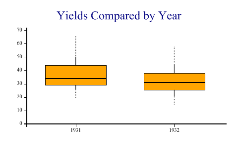 Home > Sample Charts > BoxPlot > Boxplot of barley data categorised by year Boxplot of barley data categorised by yearA selection of simple Box-and-Whisker charts are developed here, all using a ‘classic’ dataset from the 1930s showing barley yields at various farms in Canada. The trials were made at 6 farms over 2 years, with 10 varieties of barley, giving 120 data-points in total. The entire dataset is shown for reference in the glossary. The object of the trial was to see what the significant effects were, and the boxplot is an ideal way to explore relationships between variables. You might also check on the histograms of various subsets of the data, maybe using a Multiple chart to split the data by various criteria. The chart shows the Median yield is about 32kg per acre, with 75% of the values falling in the range 26-42. There are outliers on both sides, and the shape of the data looks a little skewed. SharpPlot has been told not to draw a Y-Axis here, as the vertical dimension is meaningless. This is drawn with ‘Deciles’ shown in the whiskers, which indicate that the lower end of the range has a few outlying values. However it is fairly clear that there was not a big difference between the years.