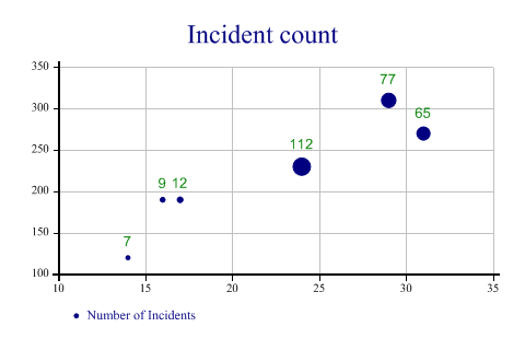 SharpPlot sp = new SharpPlot; sp.Heading = "Incident count"; sp.SetXTickMarks(5); sp.SetYTickMarks(50); sp.SetMarkers(Marker.Bullet); sp.BubbleChartStyle = BubbleChartStyles.GridLines|BubbleChartStyles.ValueTags; sp.SetValueTags(count); sp.SetValueFont("Arial",10); sp.DrawBubbleChart(ydata,xdata,count); sp.SetKeyText("Number of Incidents"); Worked Examples