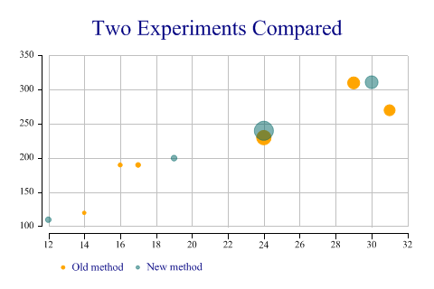Home > Sample Charts > BubbleChart > Two categories, to compare series Two categories, to compare seriesThis chart is a variant of the standard ScatterPlot with the size of the markers used to show an extra dimension in the data. The third argument gives the required marker area (typically the number of incidents recorded at a certain location) and all the markers are automatically scaled to cover the range of areas given. This chart shows data collected from two similar experiments, and allows a quick comparison of the success of each (maybe the number of seeds which germinated under given lighting and temperature). Note that the axes are ‘exploded’ here to keep them out of the way of the data. Note also the use of semi-transparent markers to avoid the second series obscuring results from the first.