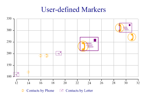 SharpPlot sp = new SharpPlot; sp.Heading = "User-defined Markers"; ydata = new int[] {190,270,310,120,190,230,200,240,311,110}; xdata = new int[] {17,31,29,14,16,23,19,24,30,12}; count = new int[] {12,65,77,7,9,112,18,194,90,17}; type = new int[] {1,1,1,1,1,1,2,2,2,2}; sp.SetColors(new Color[]{Color.Orange,Color.Purple}); // Telephone and Letter symbols sp.SetMarkers(new Marker[]{(new Marker("wingdings,9,)")),new Marker("wingdings,9,+")}); sp.BubbleChartStyle = BubbleChartStyles.GridLines|BubbleChartStyles.ExplodeAxes; sp.SplitBy(type); sp.DrawBubbleChart(ydata,xdata,count); sp.SetKeyText(new string[]{"Contacts by Phone","Contacts by Letter"}); Worked Examples