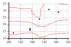 SharpPlot sp = new SharpPlot; sp.SetMargins(6,18,18,4); sp.SetMarkers(Marker.Bullet); sp.ContourPlotStyle = ContourPlotStyles.GridLines|ContourPlotStyles.Curves; sp.SetXTickMarks(50); sp.SetZTickMarks(50); sp.MeshDensity = 5; ydata = new int[] {190,270,310,120,190,230}; xdata = new int[] {17,31,29,14,16,24}; elevation = new int[] {12,65,77,7,9,112}; sp.DrawContourPlot(ydata,xdata,elevation); Worked Examples