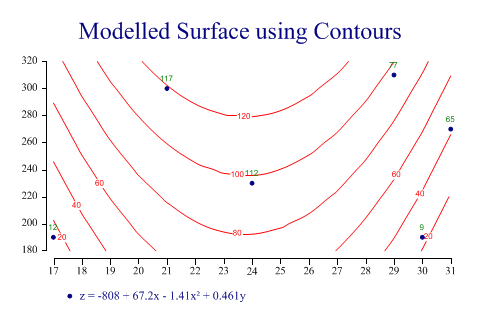Home > Sample Charts > ContourPlot > A Simple 2-variable Regression Surface A Simple 2-variable Regression SurfaceContour plots are often an excellent alternative to 3D presentations where the object is to model three-dimensional data. Obviously, they can be used ‘just like a map’ where you may have a set of spot-heights (z-values) at various locations on the xy-plane. This example fits the same Quadratic surface as the third CloudChart tutorial. You can see that several of the points fall on the ‘wrong’ side of the line, which is very reasonable for a noisy dataset where the Z-values may be subject to a large random error. The Cloudchart is probably a better tool for an initial visualisation, but the Contourplot is much more suitable if you want to answer questions like “what is the best estimate for z, given x and y” as you can easily read off the required numbers.