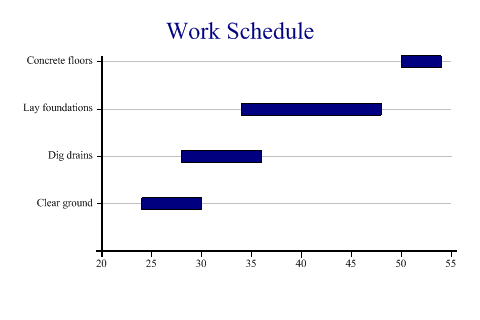 SharpPlot sp = new SharpPlot; sp.Heading = "Work Schedule"; todo = new string[]{"","Clear ground","Dig drains","Lay foundations","Concrete floors"}; sp.SetYLabels(todo); startwk = new int[] {24,28,34,50}; endwk = new int[] {30,36,48,54}; ydata = new int[] {1,2,3,4}; sp.MarginLeft = 72; sp.YAxisStyle = YAxisStyles.ForceZero|YAxisStyles.GridLines; sp.SetXTickMarks(5); sp.DrawGanttChart(ydata,startwk,endwk); Worked Examples