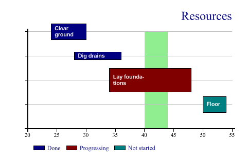 SharpPlot sp = new SharpPlot; sp.Heading = "Resources"; sp.HeadingStyle = HeadingStyles.Right; todo = new string[]{"Clear ground","Dig drains","Lay foundations","Floor"}; startwk = new int[] {24,28,34,50}; endwk = new int[] {30,36,48,54}; ydata = new int[] {4,3,2,1}; status = new string[]{"Done","Done","Progressing","Not started"}; resources = AE.Times(0.33,new int[] {2,1,3,2}); sp.SetValueFont("Arial",8,FontStyle.Bold,Color.White); sp.SetValueTags(todo); sp.ValueTagStyle = ValueTagStyles.Inside; sp.ValueTagFormat = "XXXXXXXX;"; sp.GanttChartStyle = GanttChartStyles.ValueTags; sp.YAxisStyle = YAxisStyles.ForceZero|YAxisStyles.GridLines|YAxisStyles.NoLabels; sp.SetXTickMarks(5); sp.SetXZones(new Zone(40,44,Color.LightGreen)); sp.SplitBy(status); sp.SetBarWidths(resources); sp.DrawGanttChart(ydata,startwk,endwk); Worked Examples