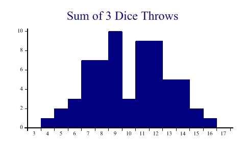 SharpPlot sp = new SharpPlot; sp.Heading = "Sum of 3 Dice Throws"; threedice = new int[] {9,8,6,11,9,14,11,8,9,14,12,7,6,11,15,14,11,7,5,8,7,9,6,7,12, 7,13,8,9,13,7,7,8,12,11,16,12,9,11,12,12,12,9,14,8,9,13,11,10,13,11,13,9, 10,10,4,14,8,9,11,12,5,12,15}; sp.HistogramStyle = HistogramStyles.SurfaceShading; sp.SetXRange(3,18); sp.XAxisStyle = XAxisStyles.MiddleLabels; sp.DrawHistogram(threedice); Worked Examples