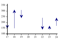 SharpPlot sp = new SharpPlot; sp.SetMargins(12,12,18,4); open = new int[] {190,150,310,240,140,170}; close = new int[] {150,310,240,140,170,240}; xdata = new int[] {17,18,19,22,23,24}; sp.SetMarkers(Marker.Bullet); sp.MinMaxChartStyle = MinMaxChartStyles.ArrowLines|MinMaxChartStyles.DriftMarkers; sp.DrawMinMaxChart(open,close,xdata); Worked Examples