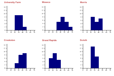 Home > Sample Charts > Multiples > A Collection of Histograms A Collection of HistogramsOne of the best innovations in Tufte’s “The Visual Display of Quantitative Information” is the idea of using an array of miniature charts to display multi-dimensional data. Often a series of values are recorded at (say) several sites or on several days, then are superimposed on a single chart as a collection of dotted and dashed lines in various colors. This often makes it very hard to see the patterns and relationships in the data. The barley-yield data could be shown on a single histogram, but often this conceals some systematic variation in the data. In this example, the farm is used to create a trellis of charts, each showing the spread of the data at the individual farms. Although the experiment was designed to investigate various barley varieties, this plot makes it very clear that the farm is going to be a big factor in the outcome. A quick glance shows that yields at Wasaca may be quite variable, but that it easily beats both Grand Rapids and Duluth (which is consistently very poor).