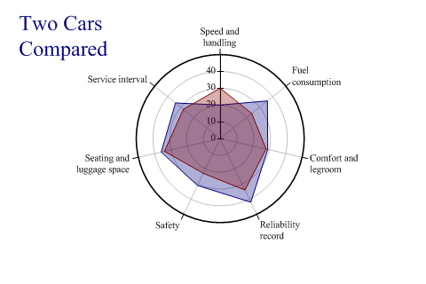 SharpPlot sp = new SharpPlot; sp.Heading = "Two Cars\nCompared"; sp.HeadingStyle = HeadingStyles.Left; Volvo = new int[] {20,36,29,42,31,36,34}; Saab = new int[] {30,24,28,34,23,34,28}; criteria = new string[]{"Speed and handling","Fuel consumption", "Comfort and legroom","Reliability record","Safety", "Seating and luggage space","Service interval"}; sp.PolarChartStyle = PolarChartStyles.GridLines|PolarChartStyles.SurfaceShading; sp.YAxisStyle = YAxisStyles.ForceZero; sp.MarginLeft = 12; sp.MarginRight = 0; sp.SetXLabels(criteria); sp.XLabelFormat = "XXXXXXXXX;"; sp.LabelLineSpacing = 120; sp.SetFillStyles(FillStyle.Opacity30); polardata = new int[][]{Volvo,Saab}; sp.DrawPolarChart(polardata,new int[0]); Worked Examples