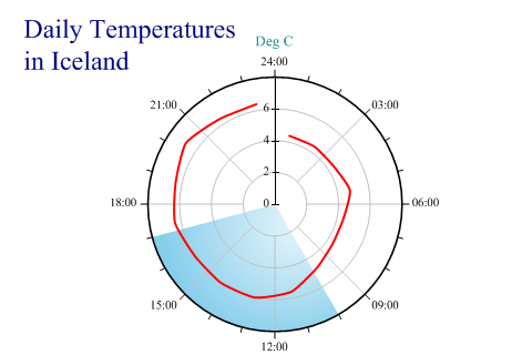 SharpPlot sp = new SharpPlot; sp.Heading = "Daily Temperatures\nin Iceland"; sp.HeadingStyle = HeadingStyles.Left; sp.SetMargins(48,12,12,0); times = new double[] {0.8,2.3,3.8,5.3,6.8,8.3,9.8,11.3,12.8,14.3,15.8,17.3,18.8, 20.3,21.8,23.3}; temps = new double[] {4.4,4.4,4.4,4.8,4.4,4.4,4.8,5.6,6,6,6,6.4,6.4,6.8,6.4,6.4}; sp.SetYRange(0,8); sp.SetYTickMarks(2); sp.SetXTickMarks(3,2); sp.YLabelFormat = "#0°"; sp.YCaption = "Deg C"; sp.SetColors(Color.Red); sp.SetPenWidths(1.5); sp.SetXZones(new Zone(10,17,Color.SkyBlue,FillStyle.Dome)); sp.PolarChartStyle = PolarChartStyles.ClockFace|PolarChartStyles.GridLines| PolarChartStyles.Curves|PolarChartStyles.HollowCenter; sp.DrawPolarChart(temps,times); Worked Examples