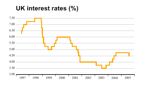 SharpPlot sp = new SharpPlot; sp.SetPenWidths(2.5); sp.SetColors(Color.Orange); sp.Heading = "UK interest rates (%)"; sp.HeadingStyle = HeadingStyles.Left; sp.SetHeadingFont("arial",16,FontStyle.Bold,Color.Black); sp.XAxisStyle = XAxisStyles.AnnualTicks|XAxisStyles.MiddleLabels|XAxisStyles.Clipped; sp.YAxisStyle = YAxisStyles.GridLines|YAxisStyles.InvisibleAxis; sp.YLabelFormat = "#.00"; sp.SetYRange(3,7.5); changedates = new int[] {35582,35582,35612,35643,35726,35947,36130,36141,36160, 36165,36192,36231,36323,36415,36495,36537,36568,36923,36951,36993,37105, 37151,37169,37204,37658,37812,37929,38023,38113,38141,38148,38205,38387, 38568,38580}; baserate = new double[] {6.25,6.5,6.75,7,7.25,7.5,7.25,6.75,6.25,6,5.5,5.25,5,5.25, 5.5,5.75,6,5.75,5.5,5.25,5,4.75,4.5,4,3.75,3.5,3.75,4,4.25,4.25,4.5,4.75, 4.75,4.5,4.5}; sp.DrawStepChart(baserate,changedates); Worked Examples