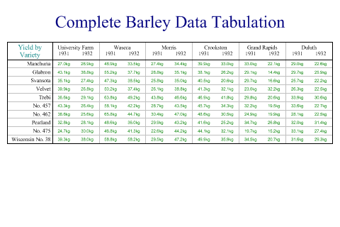 SharpPlot sp = new SharpPlot; sp.Heading = "Complete Barley Data Tabulation"; sp.SetMargins(36,0,0,0); sp.DrawFrame(); sp.SplitBy(_barleyfarm); sp.SplitBy(_barleyyear); sp.GroupBy(_barleyvariety); sp.TableStyle = TableStyles.GridLines|TableStyles.Spanned|TableStyles.FitWidth; sp.YCaption = "Yield by\nVariety"; sp.ValueTagFormat = "##0.0kg"; // Formatter sp.ValueTagStyle = ValueTagStyles.Center; sp.DrawTable(_barleydata); Worked Examples